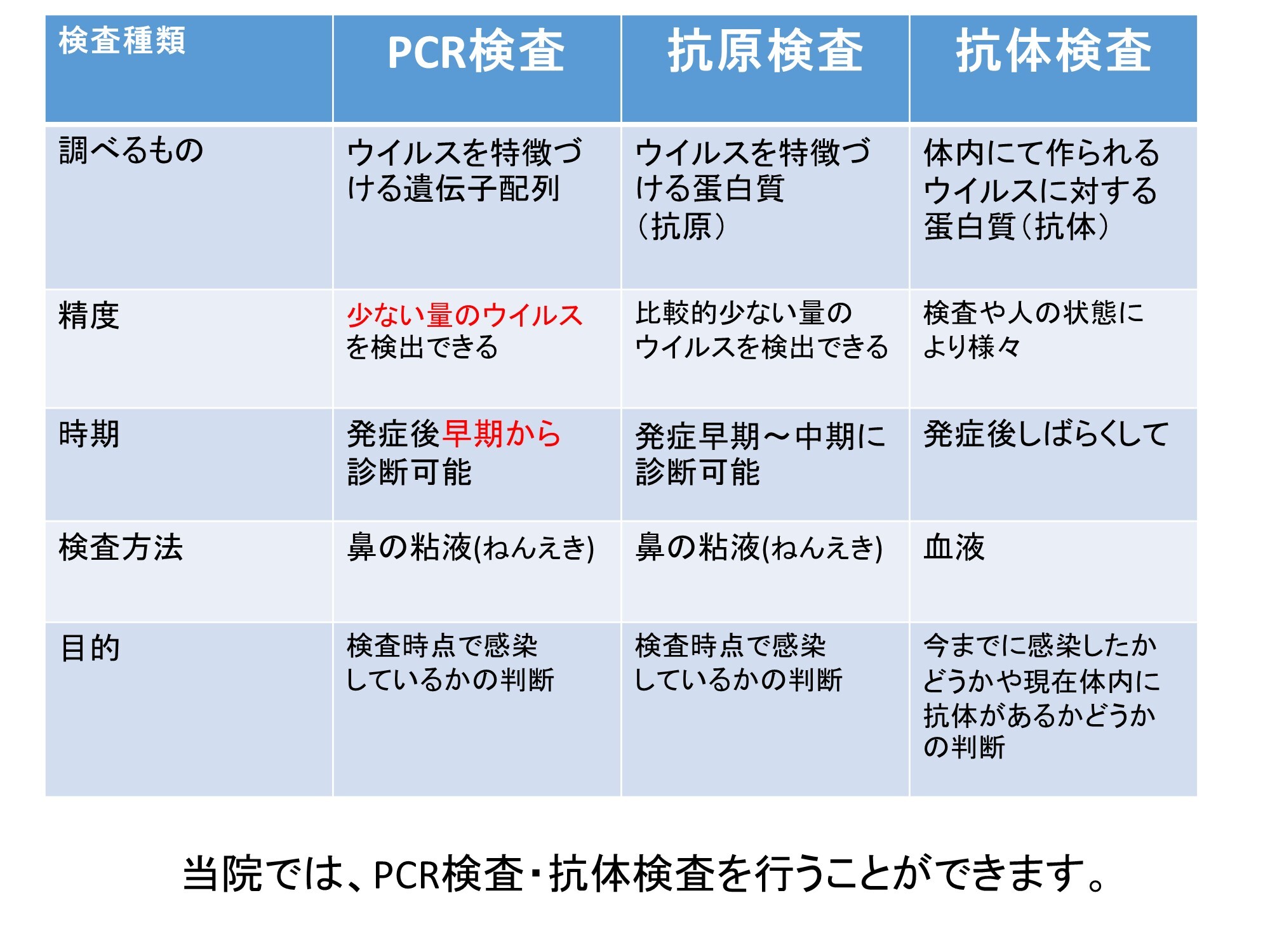 当院では濃厚接触者でない方・症状がない方で証明書が必要な方のみに検査を行います。 感染の有無をしらべるPCR検査、抗体価や感染の既往を調べる抗体検査の2種類があります。 違いにつきましては下記の表を参考としてください。 不明な点につきましては受付にお声がけをして相談ください。